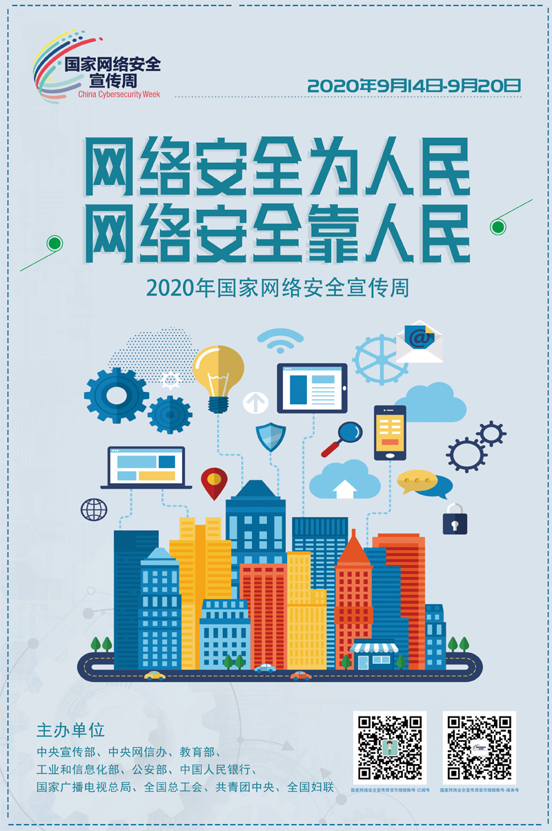 2020年国家网络安全宣传周将于9月14日至20日在全国范围内统一开展,主题为“网络安全为人民,网络安全靠人民”,由中央宣传部、中央网信办、教育部、工业和信息化部、公安部、中国人民银行、国家广播电视总局、全国总工会、共青团中央、全国妇联等部门联合举办。